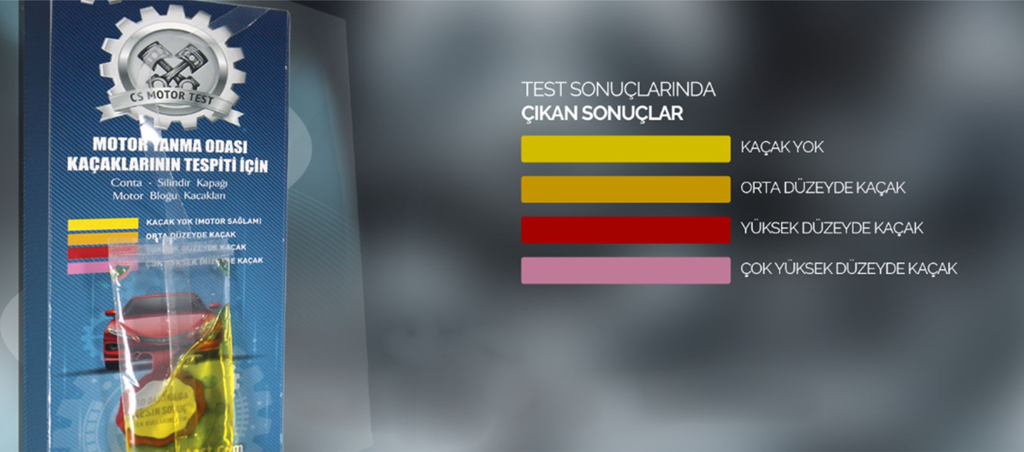 Dynobil, Yetkili CS Motor Test Merkezi ve Satış Temsilcisidir. CS Motor Test, Silindir Kapak Conta Yanıklarını, Motor Bloğu Kaçaklarını sadece 10 dakika içerisinde %100 tespiti konusunda Türk kimya mühendislerince geliştirilmiş, yenilikçi, basit bir çözümdür.